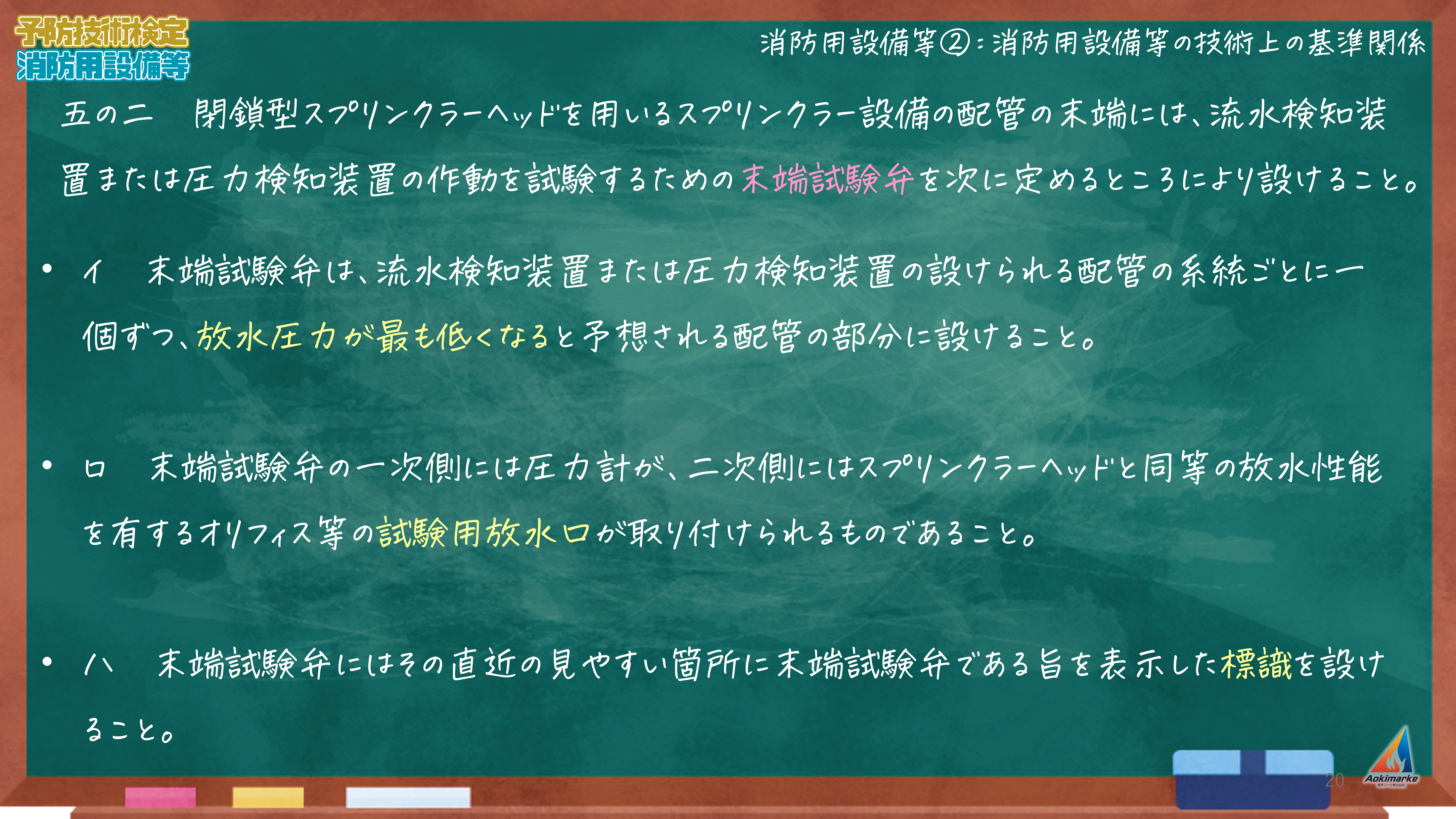 2 閉鎖型スプリンクラーヘッドを用いるスプリンクラー設備の末端試験弁は、流水検知装置または圧力検知装置の設けられる配管の系統ごとに1個ずつ、放水圧力が最も低くなると予想される配管の部分に設けること。