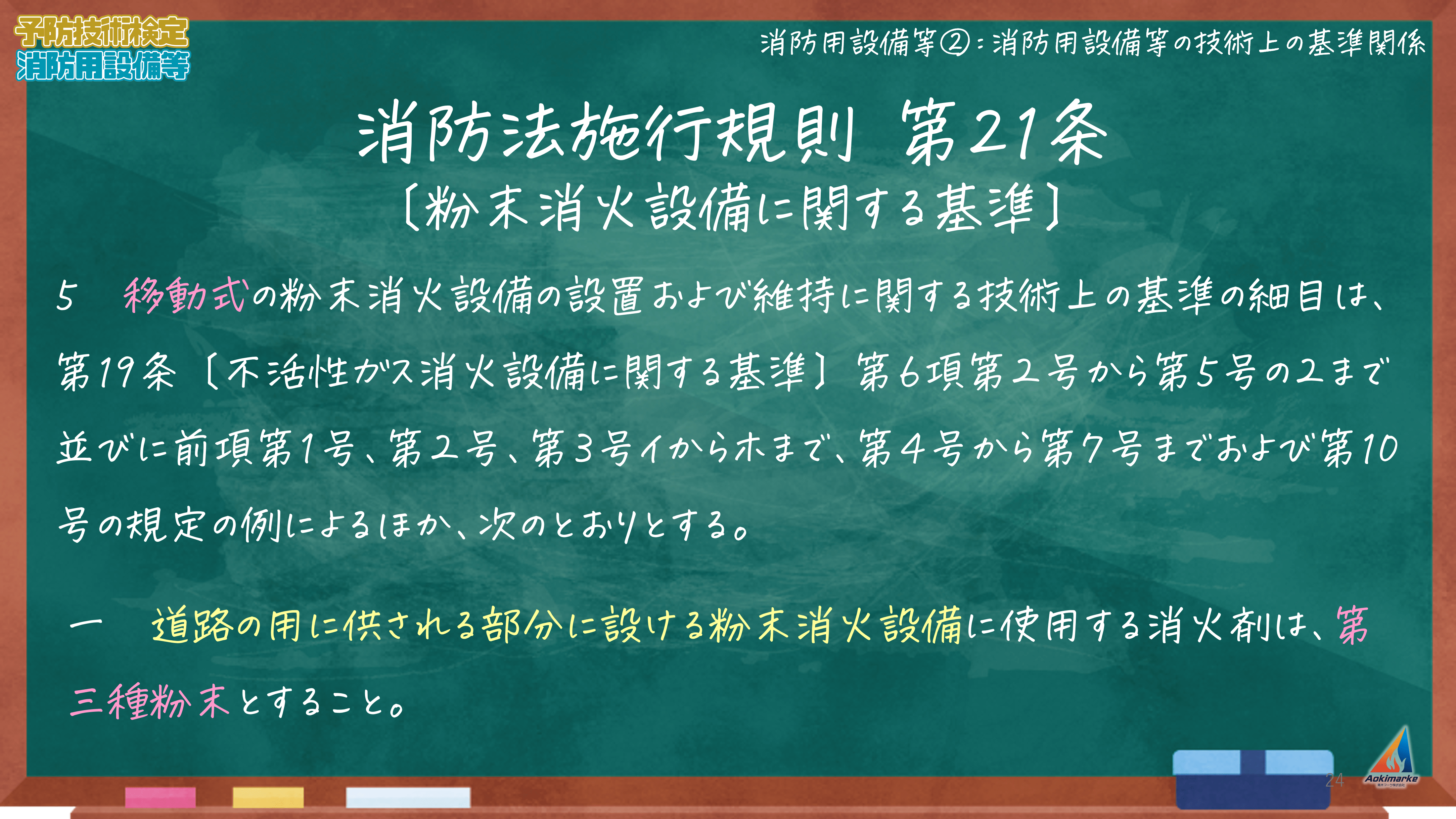 3 道路の用に供される部分には、全域放出方式または局所放出方式の粉末消火設備を設けなければならない。