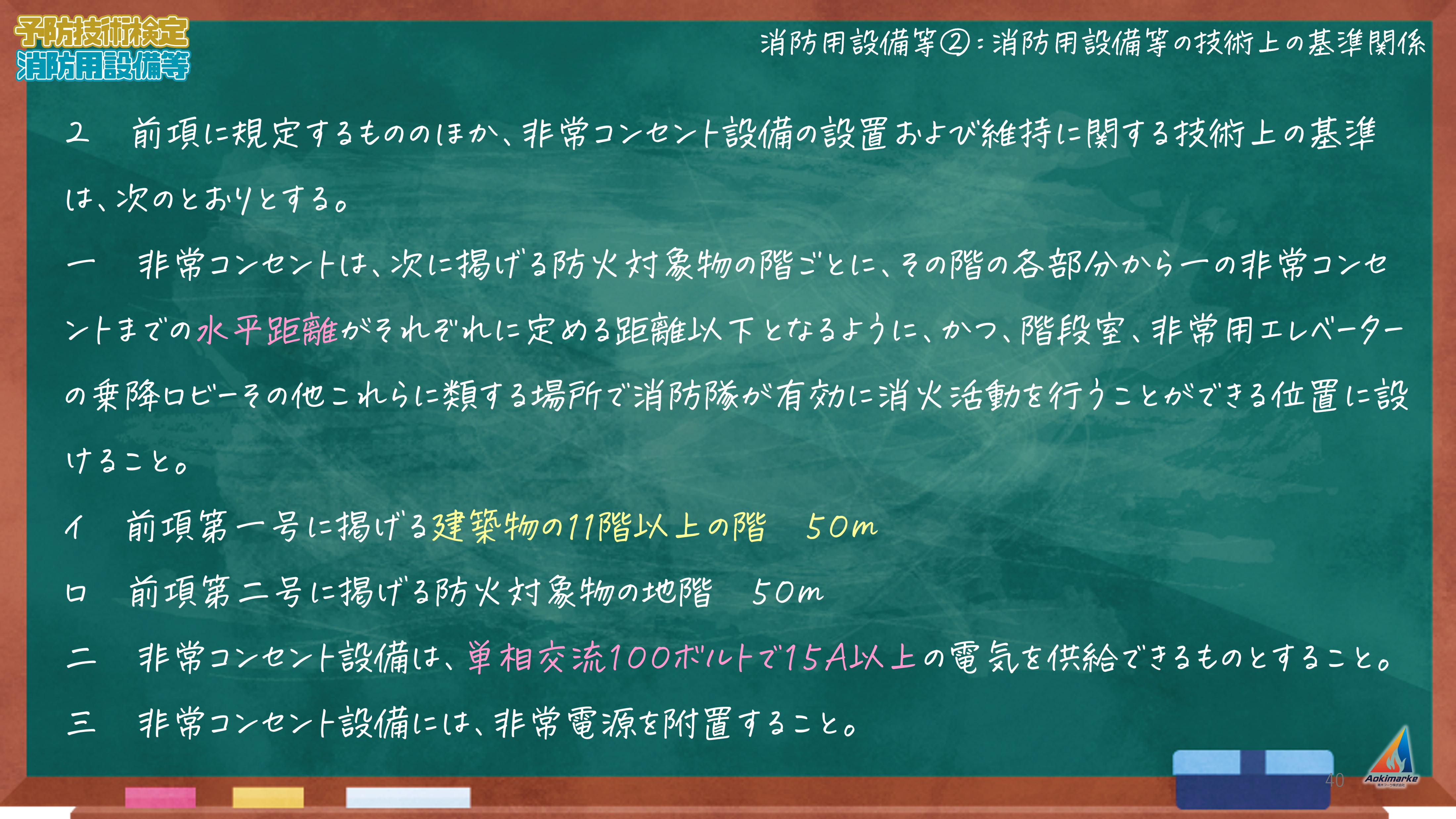 ここでは「消防用設備等②:消防用設備等の技術上の基準関係」に関する内容の学習および、その範囲で出題される過去問と解説をしていきます。